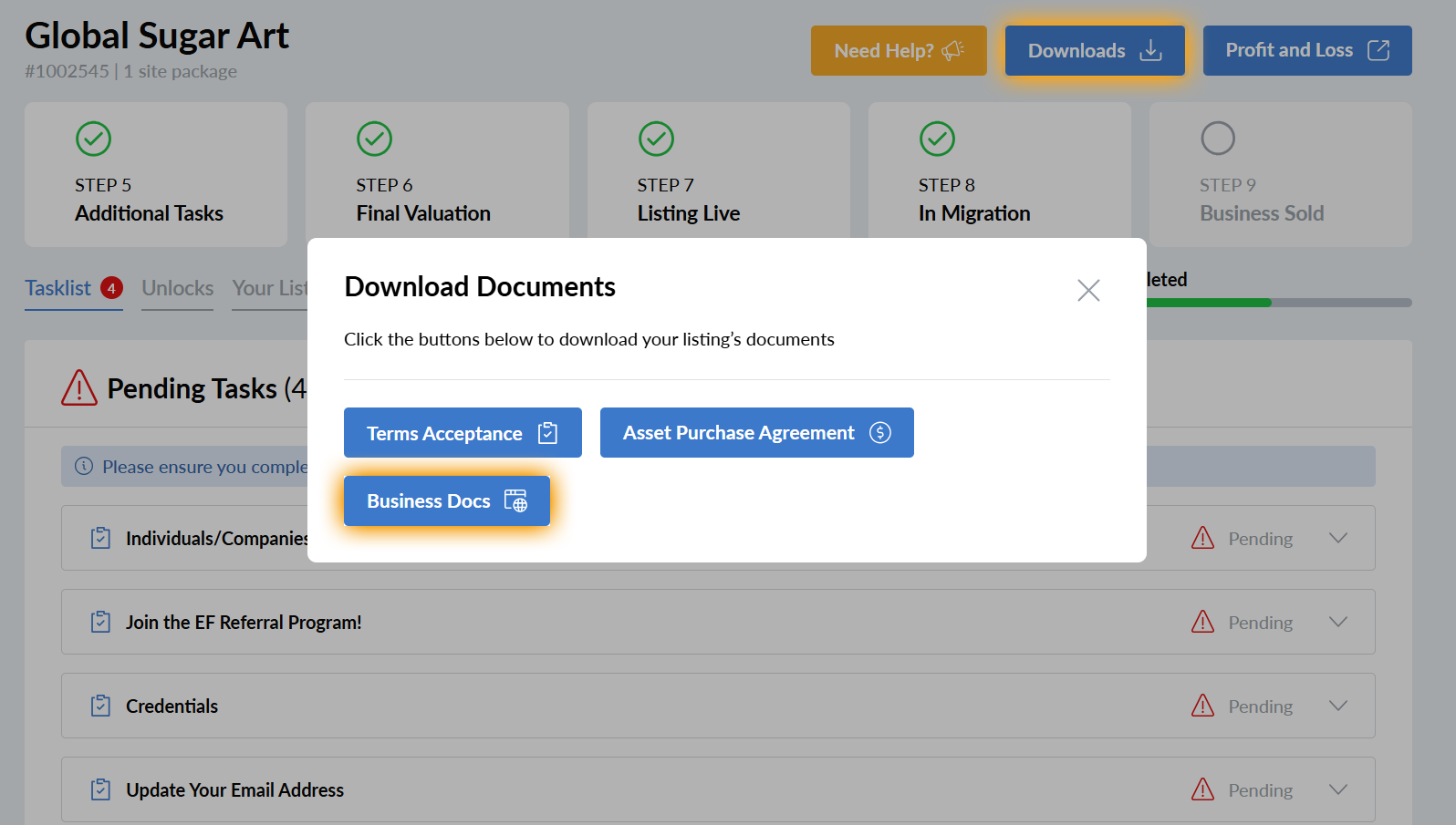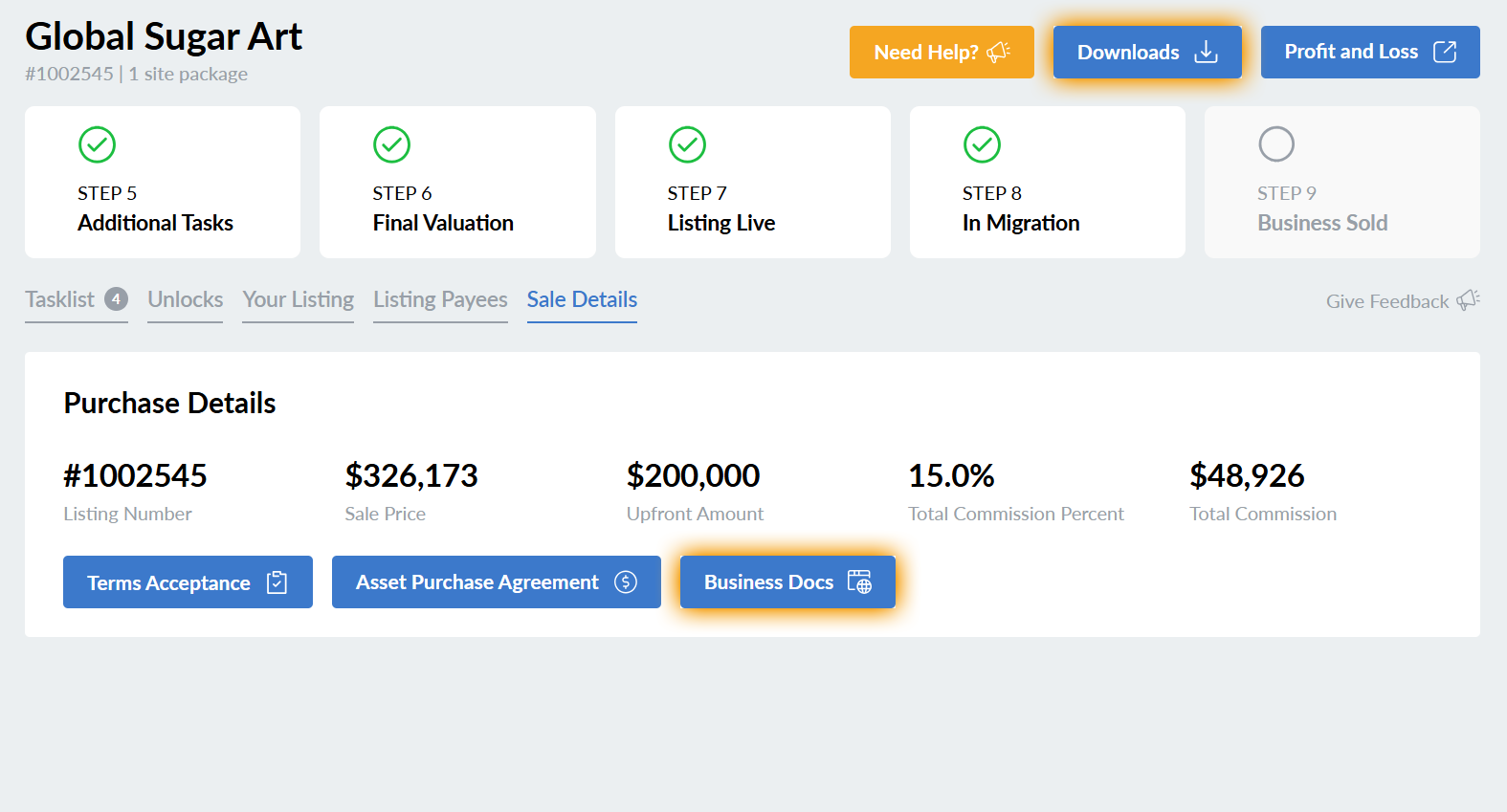 You can now easily access all your important deal documents even after your sale is complete. We’ve added a “Business Docs” button to both the “Downloads” pop-up and the “Purchase Details” tab for buyers and sellers. This ensures you have continued access to essential files like the Asset Document — right when you need them.