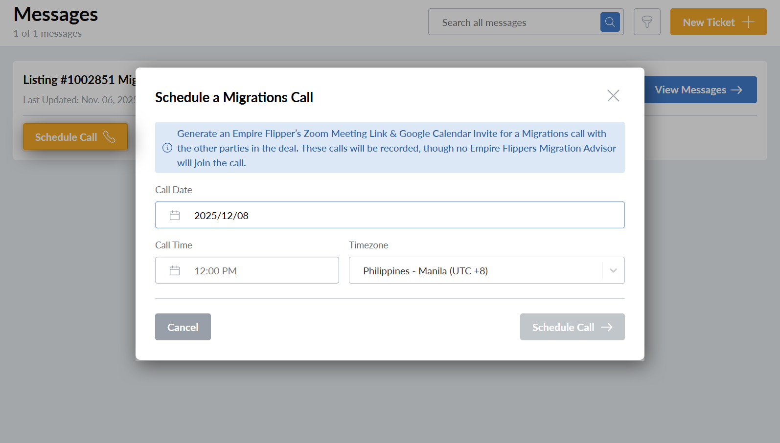 Now buyers and sellers are able to directly schedule calls within Migration conversations in the Messages dashboard to coordinate their migration.