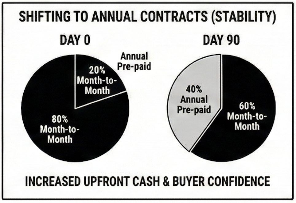 Track your annual contract percentage closely. If you can increase annual contracts from 20% to 40% within 90 days, it can significantly boost the valuation of your business.